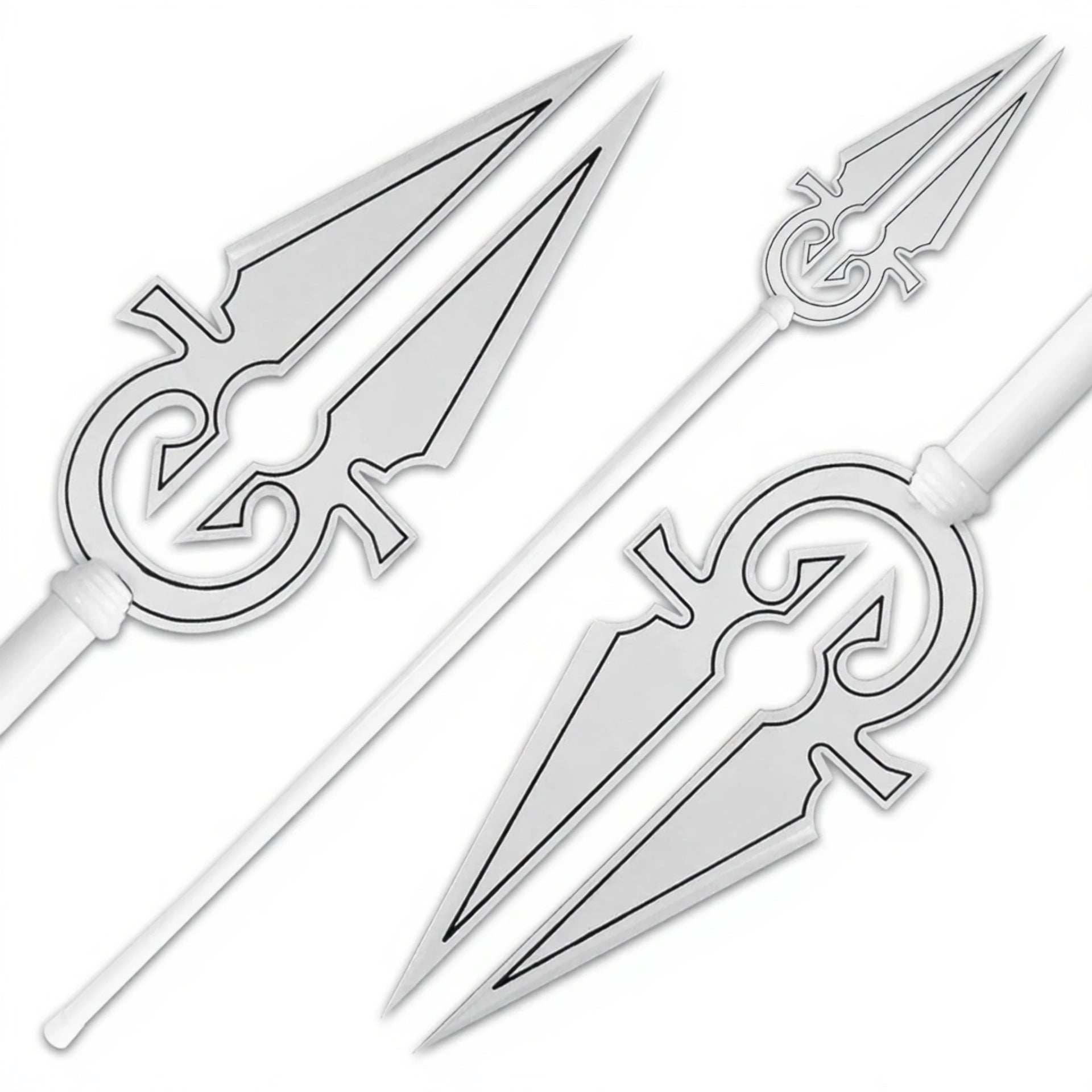 This spear features a shimmering silver finish with intricate engravings, reflecting the purity and divine energy it represents. Its long, balanced design makes it a commanding presence in any collection.