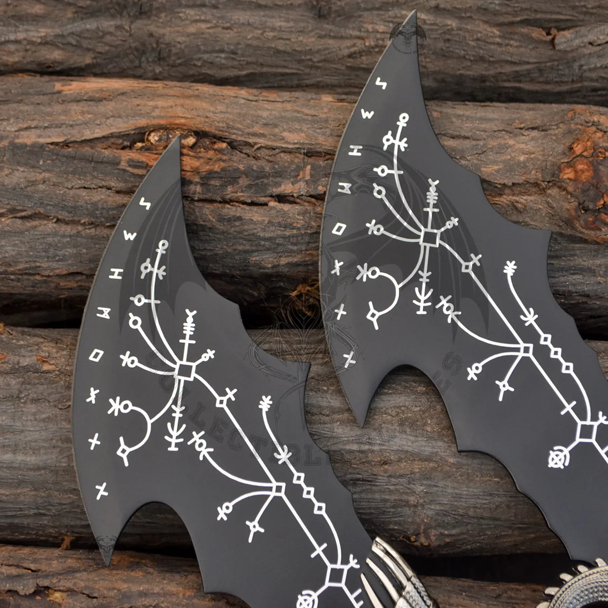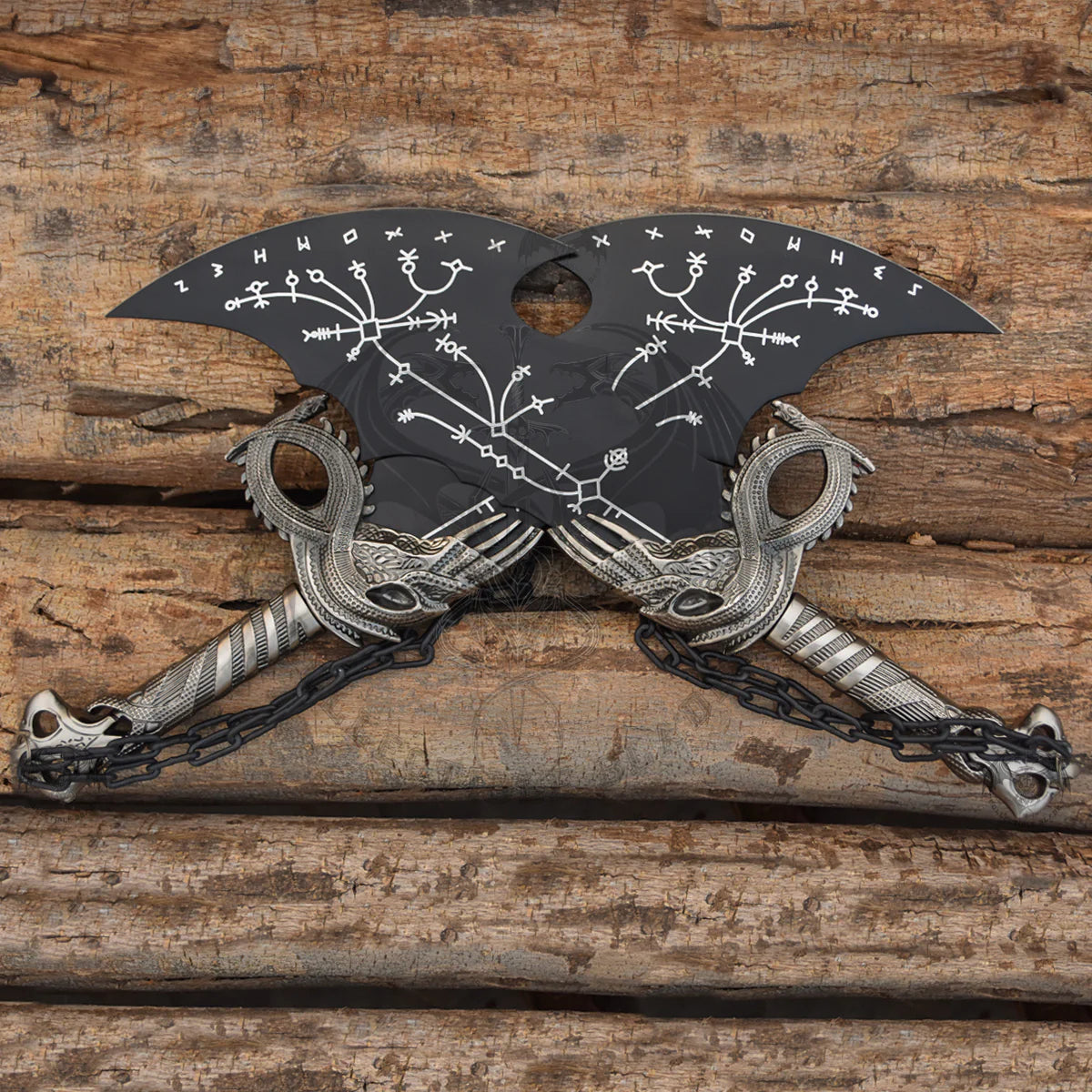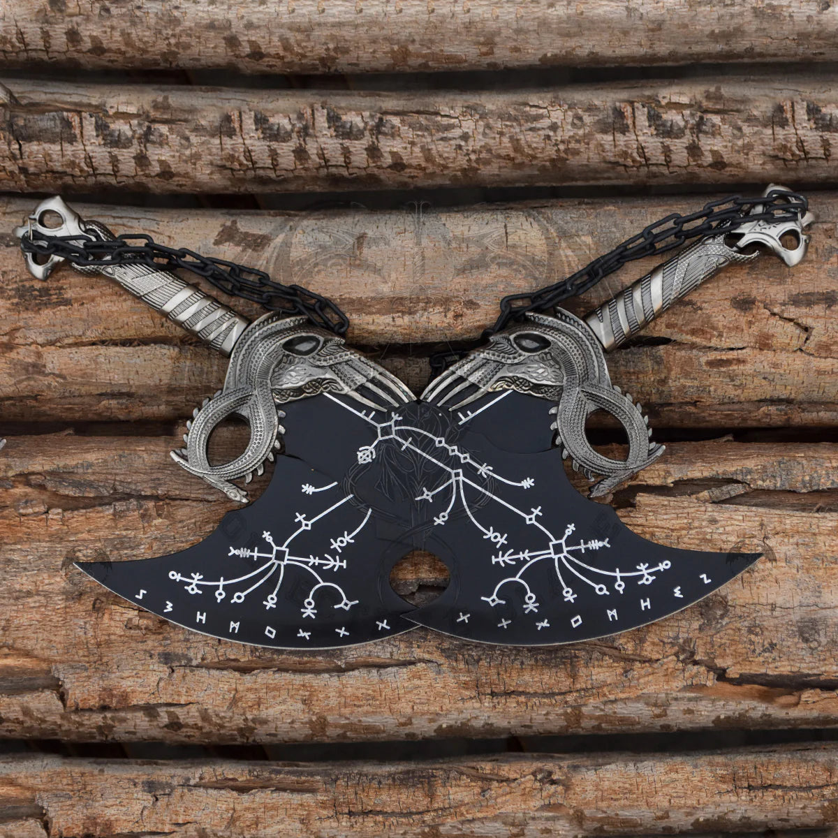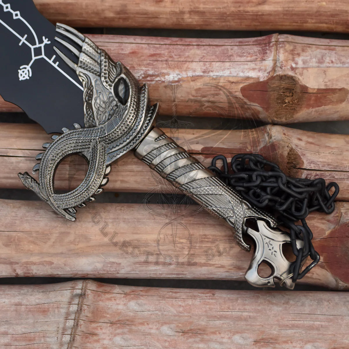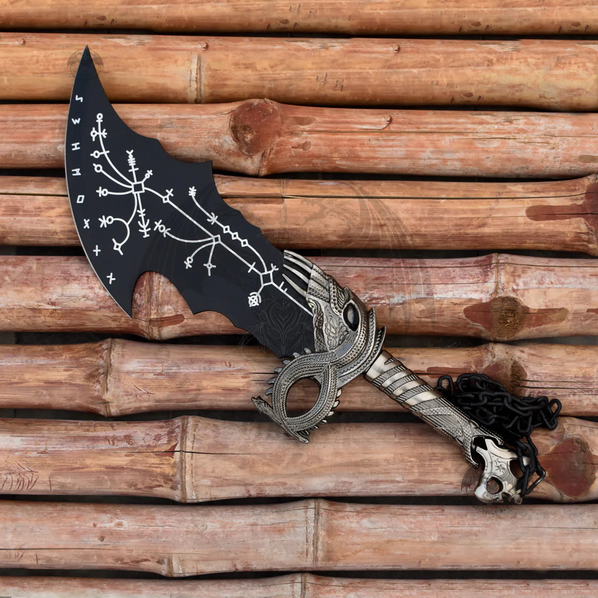 This blade draws inspiration from Norse mythology, symbolizing destruction and resilience. Its dark etched design represents the chaotic battles fought by Kratos, capturing the spirit of divine warfare.