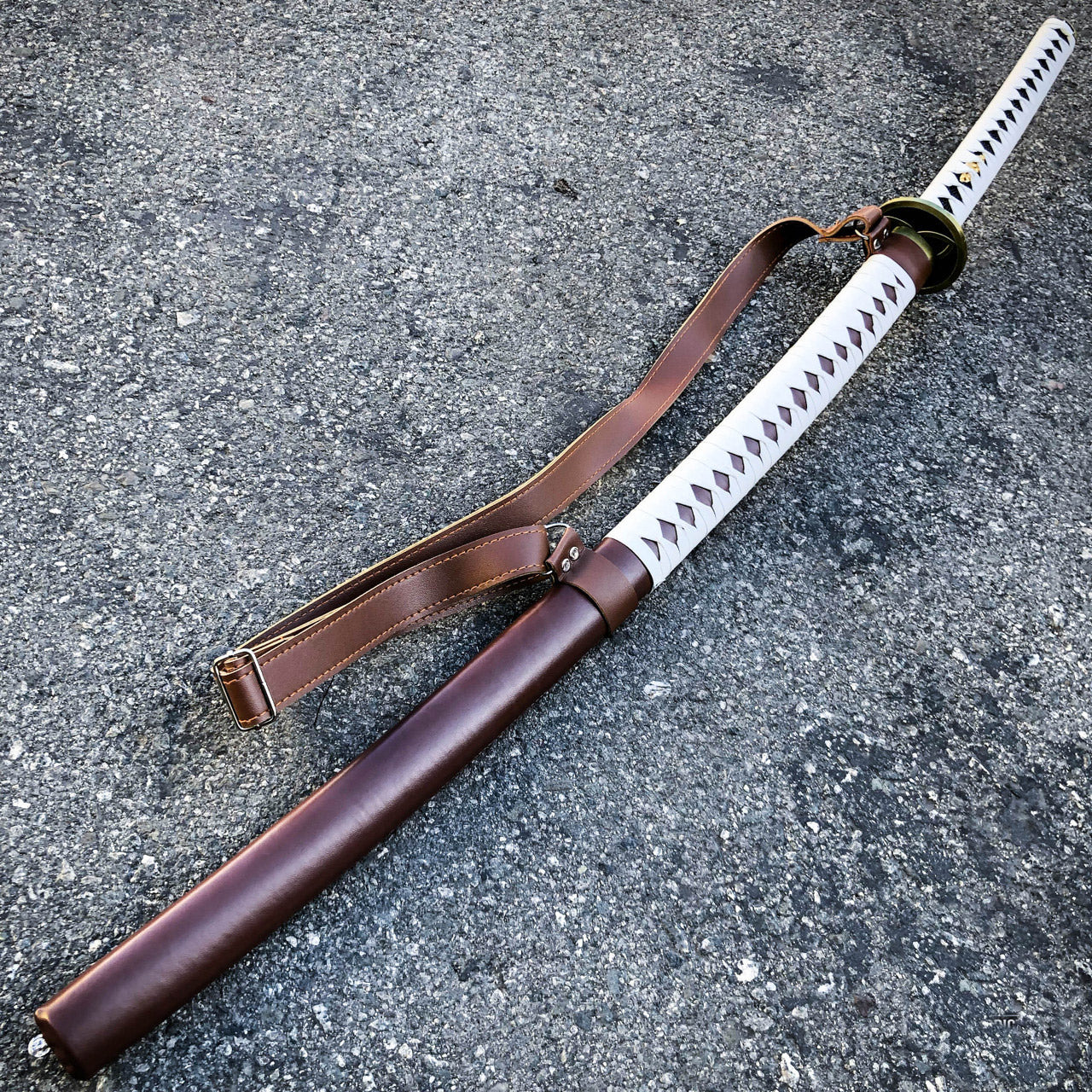 A: Its white scabbard, leather wrapping, and blade design replicate Michonne’s katana from the show.