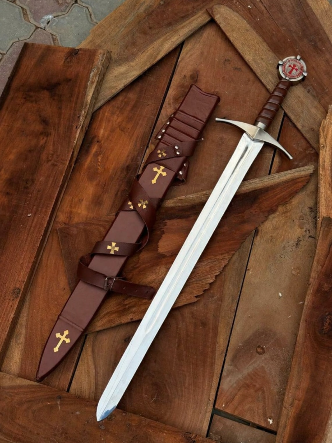 This sword’s design reflects the proud legacy of knights who fought under the sign of the cross. Featuring a polished double-edged blade, brass-finished crossguard, and a crimson-wrapped hilt, every detail echoes the nobility and devotion of medieval warriors. The engraved Templar cross on the pommel adds an authentic and spiritual touch to this legendary weapon.