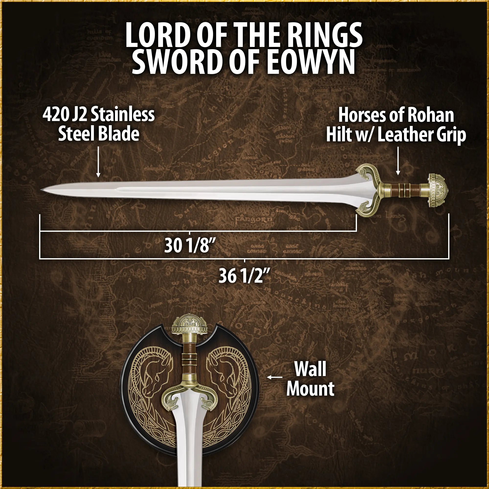 The Sword of Éowyn reflects both her nobility and her fierce spirit. Its design carries the cultural heritage of Rohan, with detailing that speaks to the kingdom’s artistry and warrior pride. From the hilt to the blade, every feature embodies Éowyn’s strength, her defiance against despair, and her unforgettable role in the War of the Ring.