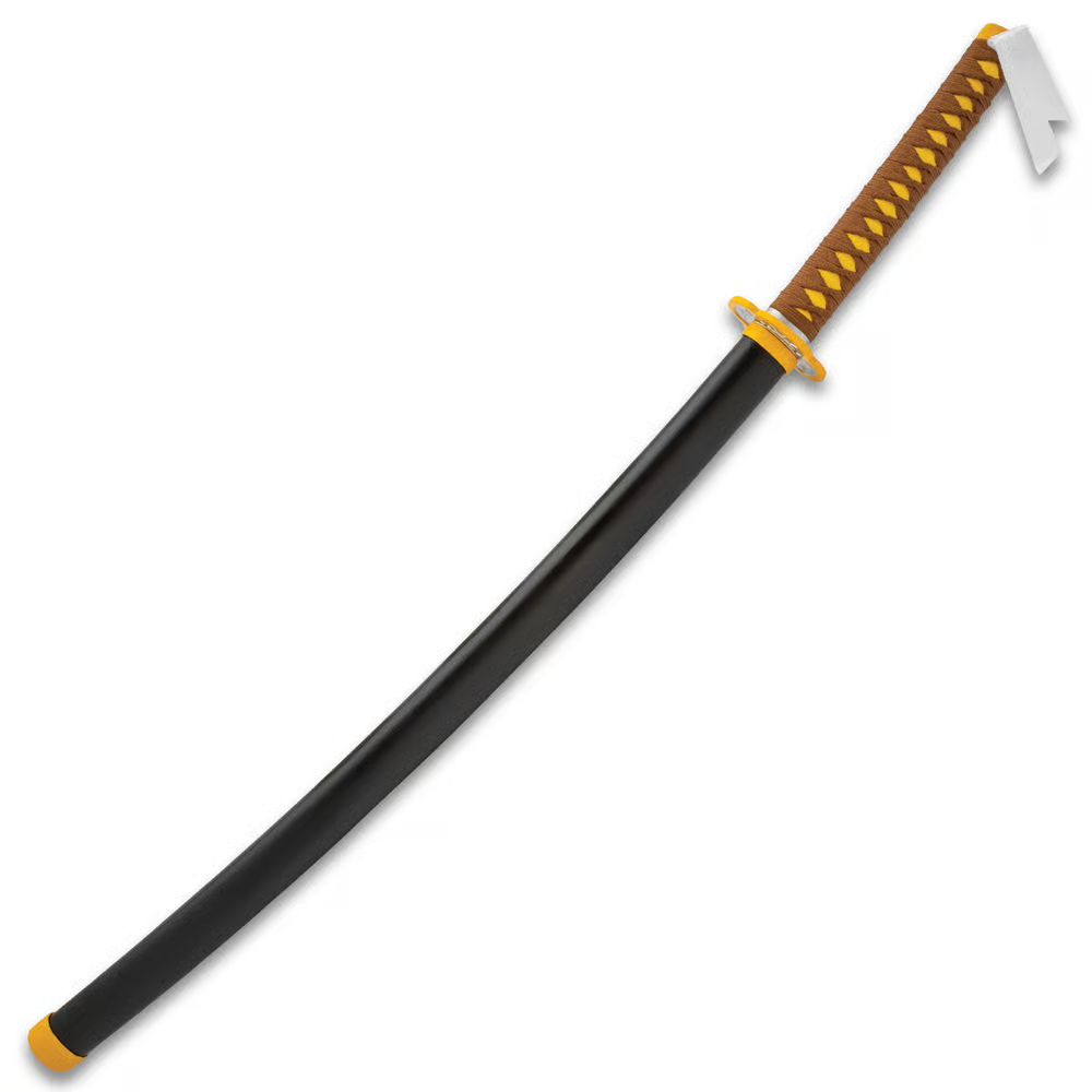The Zenitsu sword replica features a stunning yellow lightning motif running down the blade, symbolizing Zenitsu’s breathtaking Thunder Breathing technique, making it a standout piece for display or cosplay.